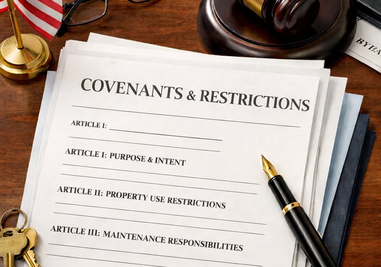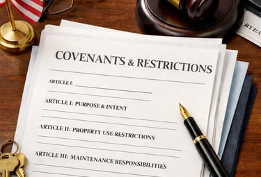 Covenants and Restrictions are the rules that set standards for property use and appearance within the community. They explain what homeowners can and cannot do with their property to help maintain consistency and protect property values.